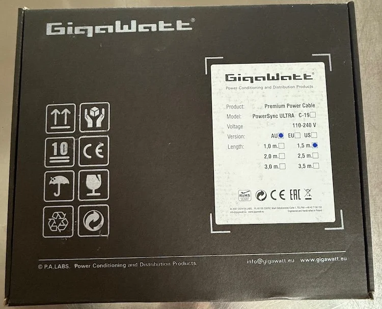 A new GigaWatt (Poland) PowerSync Ultra power cord, with their custom high-end 3pin (AU/NZ 3112) Rhodium plated plug & IEC socket - 1.5m long.