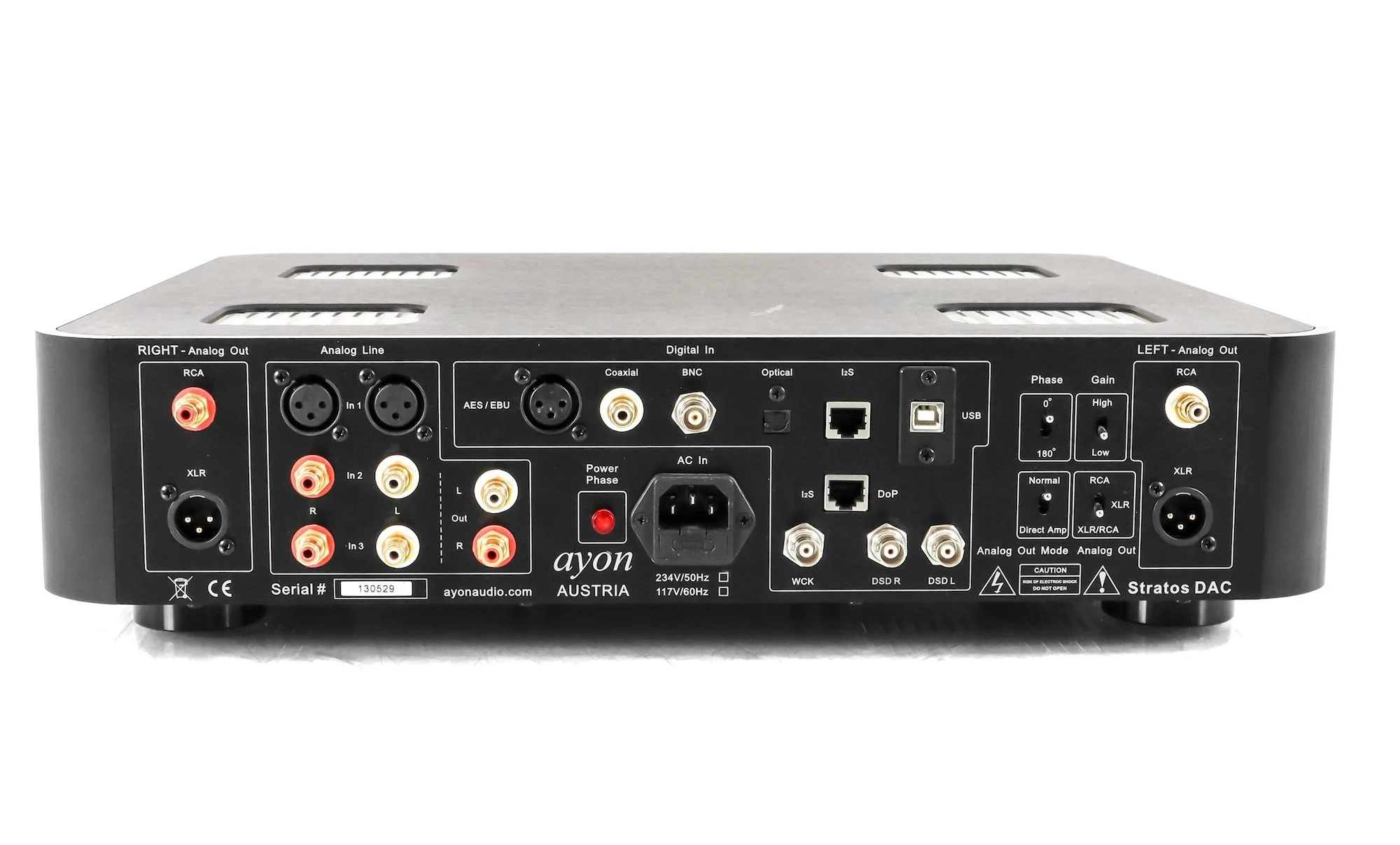 Ayon Audio audiophile “Stratos “ reference DAC. The Stratos is prepared for computer playback and general DSD professional audio use. The quad differential gain stage is composed of 2 high performance tubes per channel. The Stratos DAC features a vastly overrated, high capacity power supply for the analog output stage with tube “bridge” rectification, choke coupling and two oversized power transformers. The sound is powerful with fantastic bass speed, extraordinary dynamic, airy, finely detailed and outstanding 3D holographic. The Stratos offers an uncompromising build and reference sound quality level in every aspect.